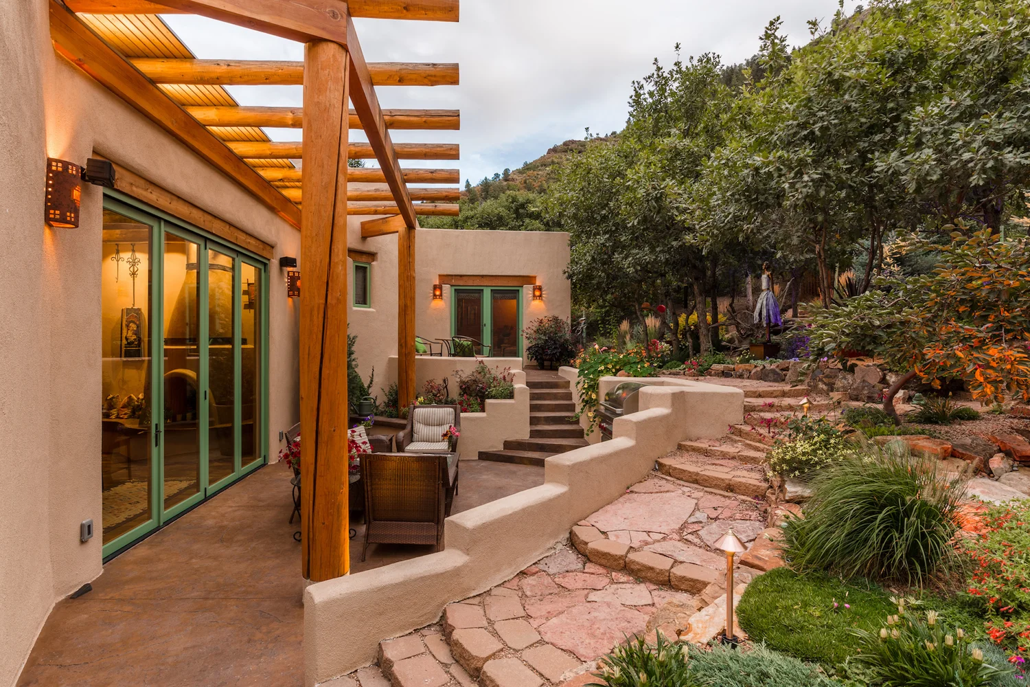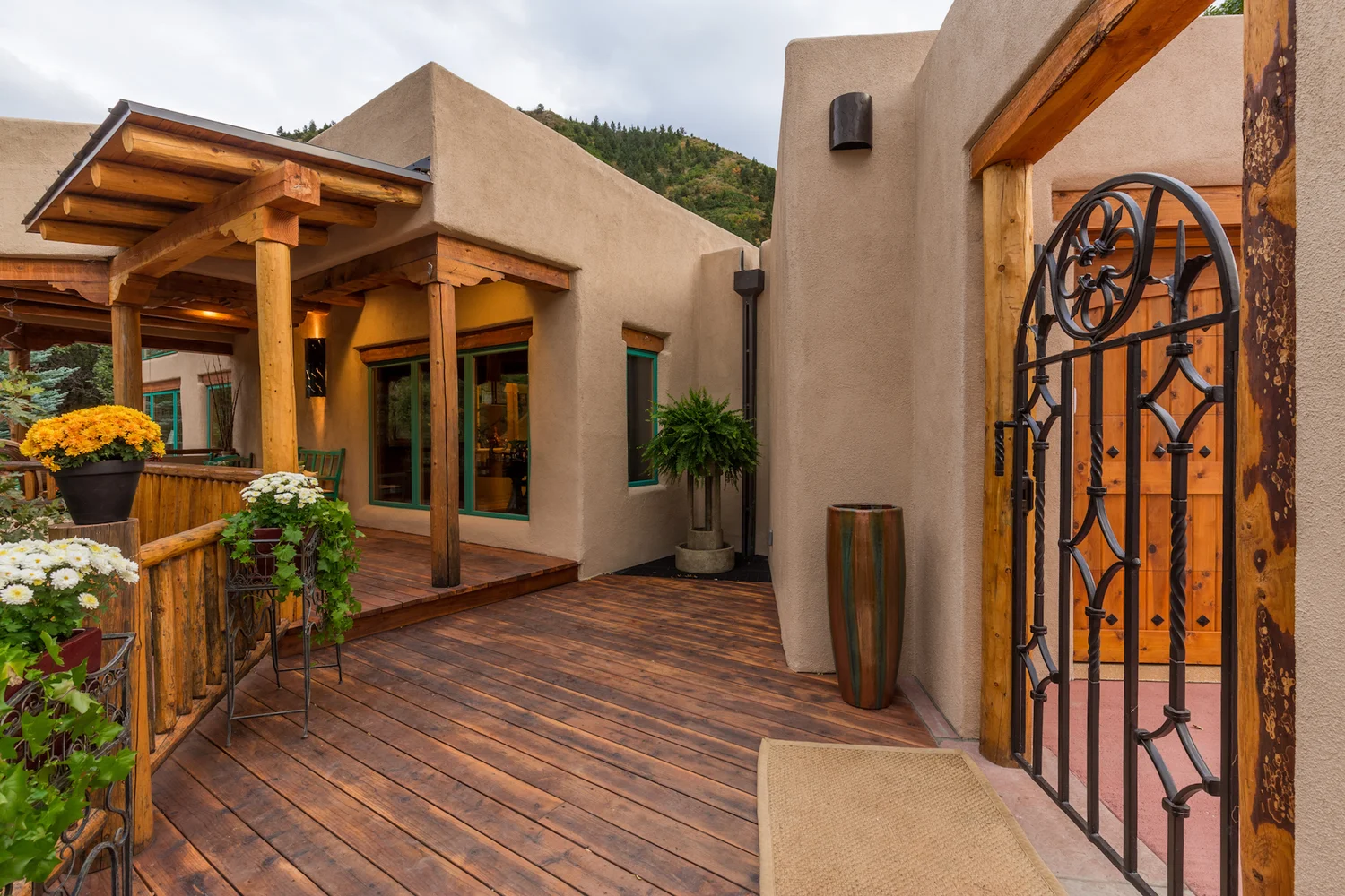 Rebuilt entry deck with vigas, corbels, log posts, and rails